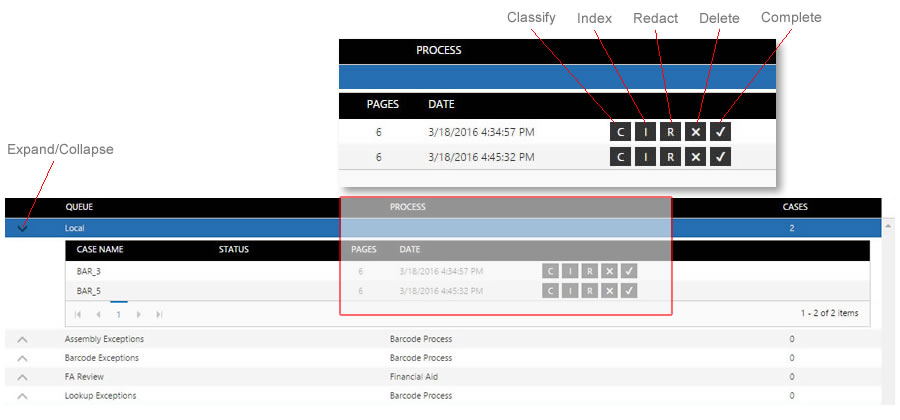 The diagram below (Figure 3) shows the case shortcuts available for each case in the queue list. Each of the case shortcuts will either open the case in the corresponding mode, or perform a housekeeping action on the case.