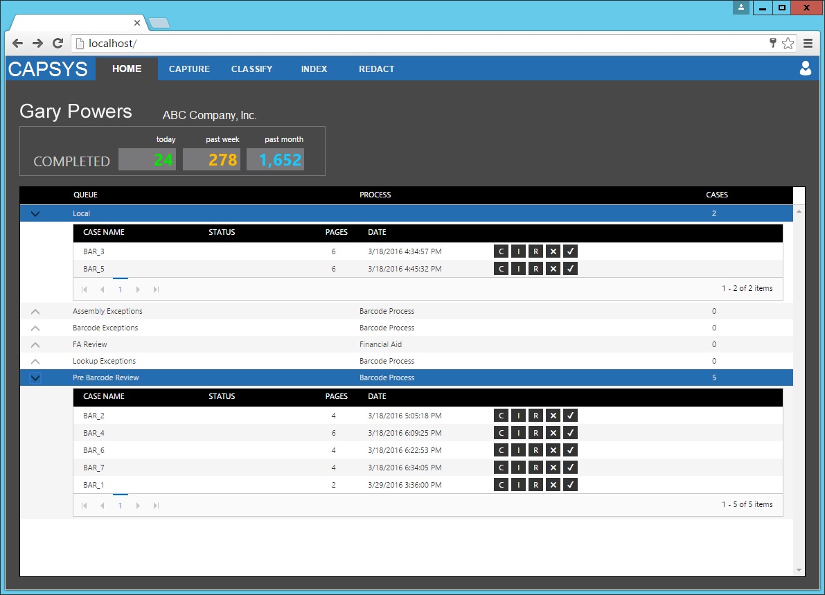 The CAPSYS CAPTURE Dashboard provides an overview of your outstanding work, and your progress. From the Dashboard you can see every queue that is assigned to you, and you can browse through a list of cases in each queue. The dashboard also provides case shortcuts for jumping right to a case to start working. The Dashboard is displayed initially upon login, and can be accessed at any time by clicking on the Home tab.