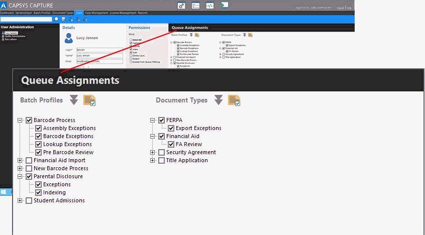 Queues - Queue Permissions specify the Queues that a user may access from the CAPSYS CAPTURE Client.