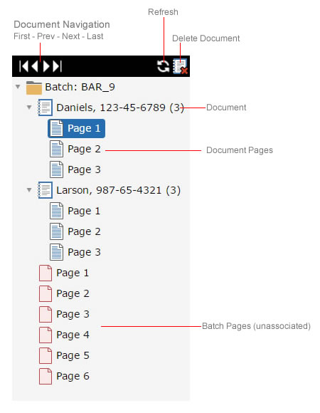 The Case Viewer can be used for page navigation by clicking on any batch or document page with your mouse. The Case Viewer also provides for navigation among the documents in the case. The Case Navigation Toolbar provides buttons for moving through documents, which can be useful when indexing documents already created by other processes or people.
