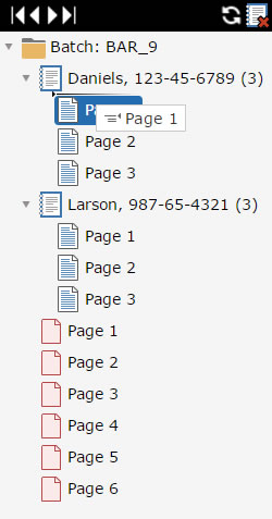 The Case Viewer can be used to re-order pages in a document, move pages from one document to another, or from a document to the batch (unassociating the page). Simply click on the desired page in the Case Viewer and drag it to it's new position.
