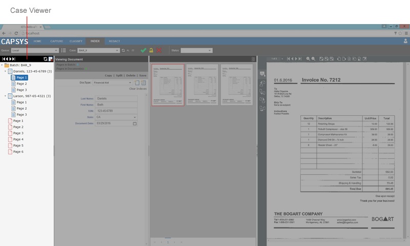 The CAPSYS CAPTURE Case Viewer provides an overview of the contents of a case, including unassociated batch pages, documents and document pages. The Case Viewer can be used for navigation, page re-ordering and for moving pages from one document to another, or to the batch.