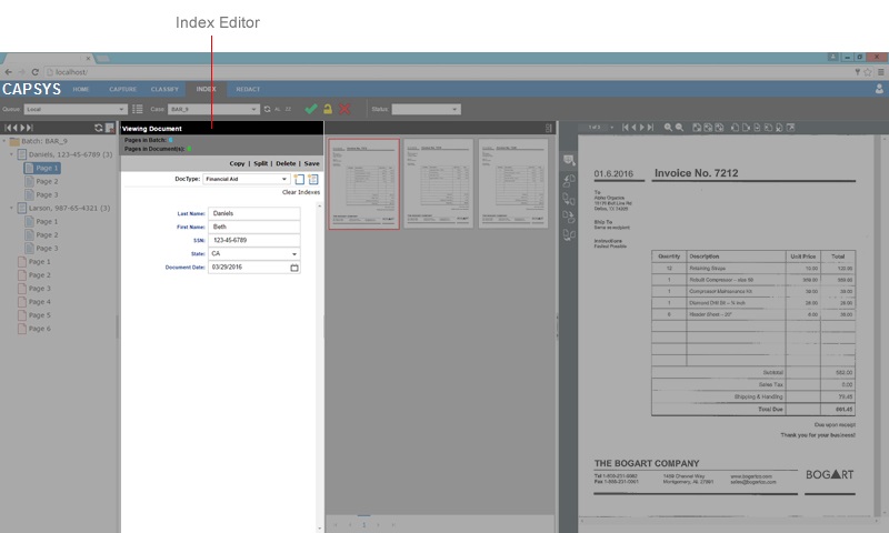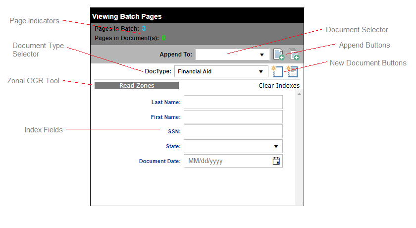 The Index Editor Controls are used to create new documents, add or edit existing document index values, and append batch pages to an existing document. Index fields may have additional properties as defined by an administrator that restrict entry to certain characters or formats, and may be configured as pick lists or database lookup fields.