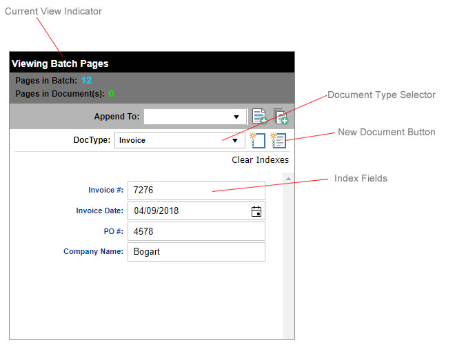 The process is then repeated for the remaining pages in the batch. For batch pages that belong to documents already created, select the target document from the Append To section of the Index Editor, and click the Append Page Button.