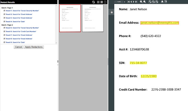 After the Search Button is clicked, the redaction targets that match the Search criteria are displayed in the results window beside the first page in the specified grouping. Each redaction target is listed in the results window, and highlighted on the corresponding page in the viewer window. Each redaction target in the list also has a check box to allow for quick de-selection of targets that are false positives, or that, in the operator’s discretion, do not need to be redacted.