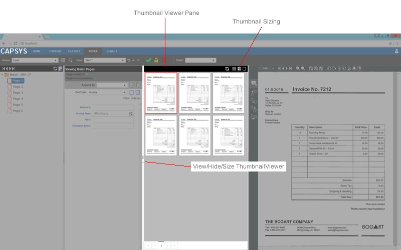 The CAPSYS CAPTURE Thumbnail Viewer provides an at-a-glance view of many pages of a batch or document at one time, while also allowing for direct navigation and page re-ordering using the mouse. From the Index Tab, the Thumbnail Viewer pane may be visible or hidden (collapsed), based on user preference. The Thumbnail Viewer may be hidden by clicking on the arrow on the Thumbnail Viewer sizing bar.